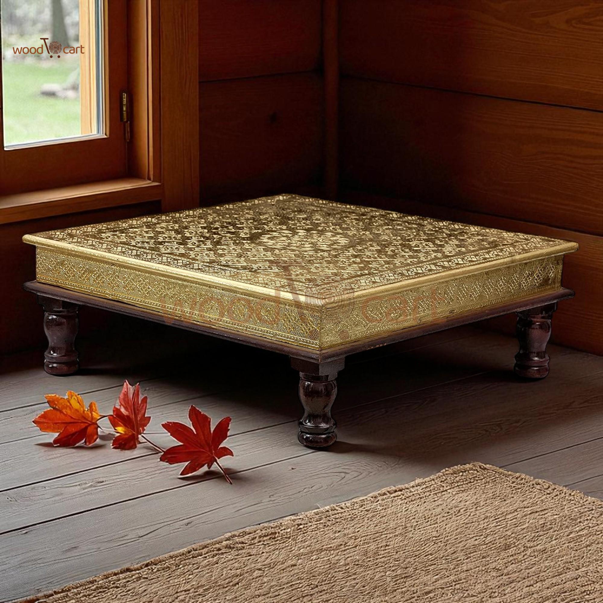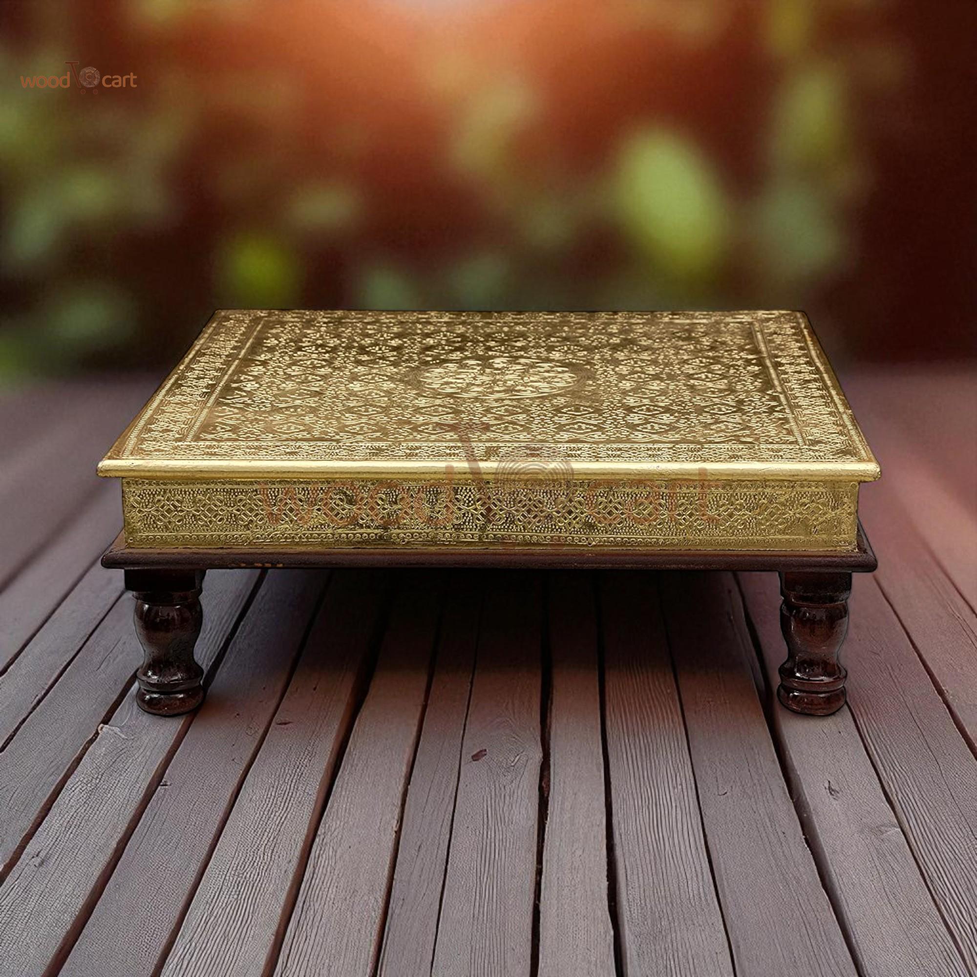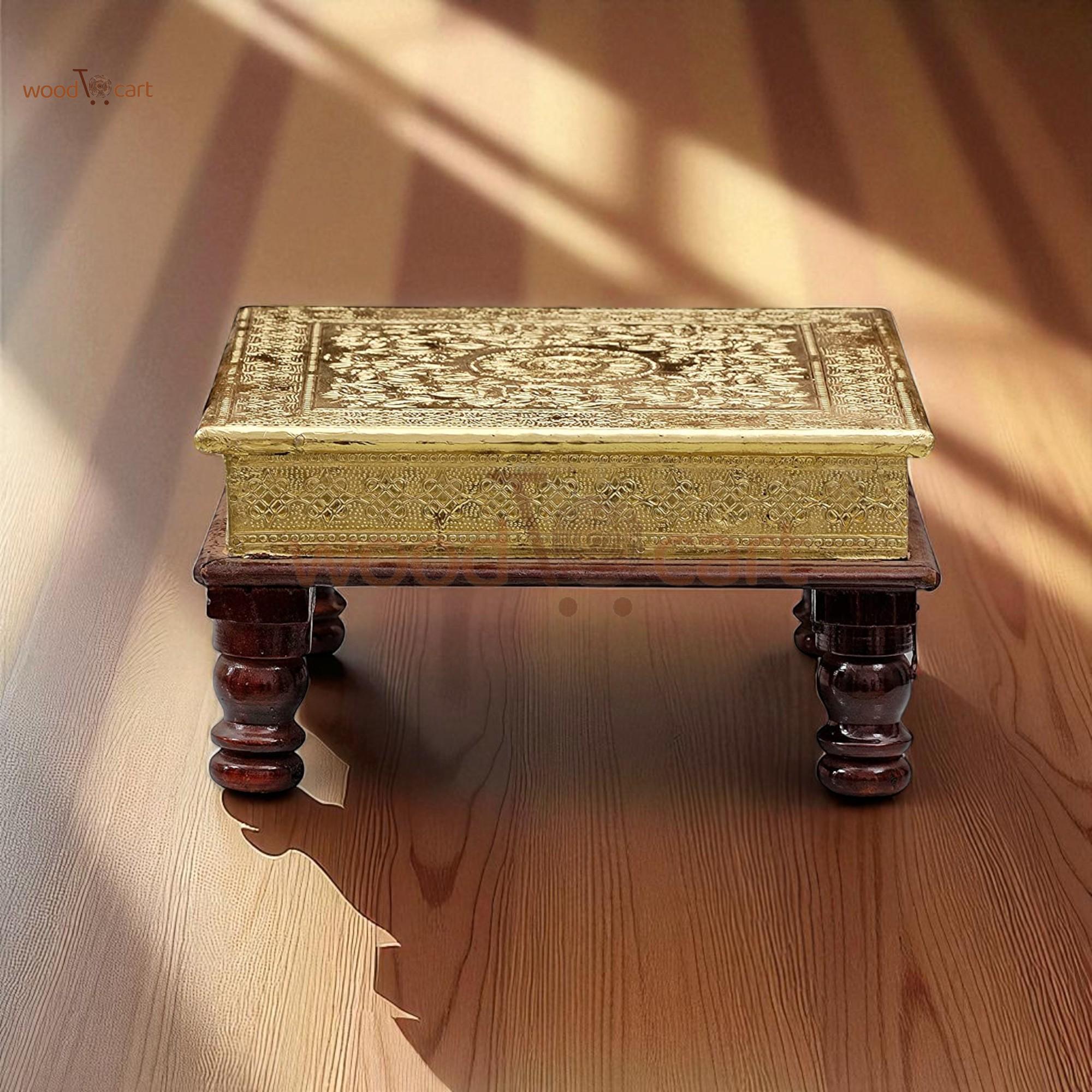 Wood To Cart® Handcrafted Wooden Pooja Chowki with Brass Design Work – Decorative Bajot for Mandir, Diwali, Navratri & Home Decor
